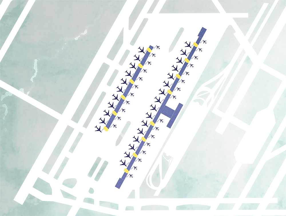 Thus they established the first BRÜCKENSTADT, or Bridge City. Originally the project name from the German engineers, the moniker referred to the bridges - fit smoothly onto the linear halls of airports - that would be iconic to these settlements. In them industry developed, on them residents could enjoy public space and services, and on legal grounds, the innovation gave residents living space while never stepping foot on national ground.